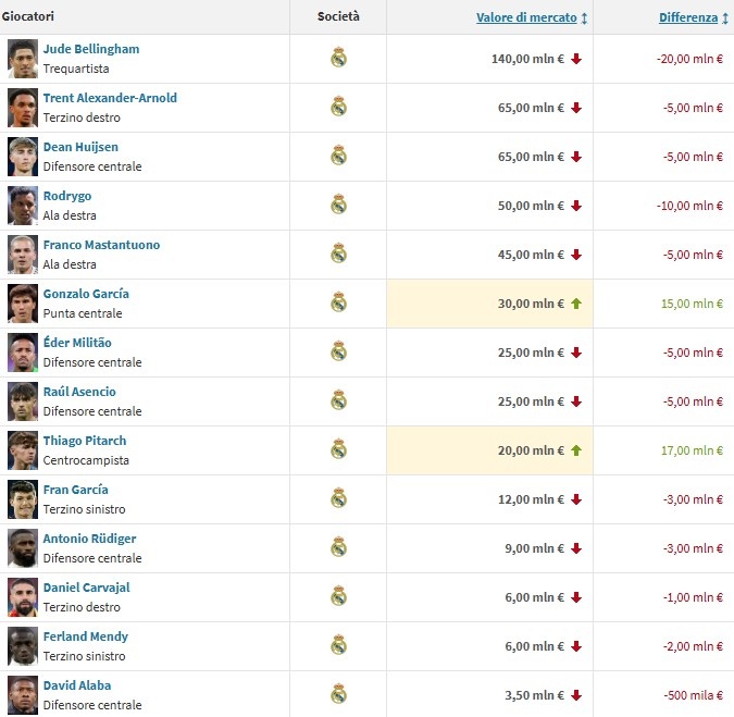 皇马球员身价变化: